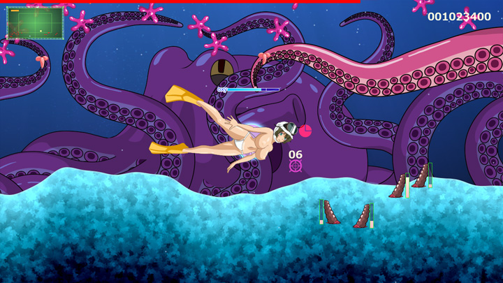 海女子ちゃんの後ろに青白いぼんやりした円が表示されていますが、それがいわゆる当たり判定です。